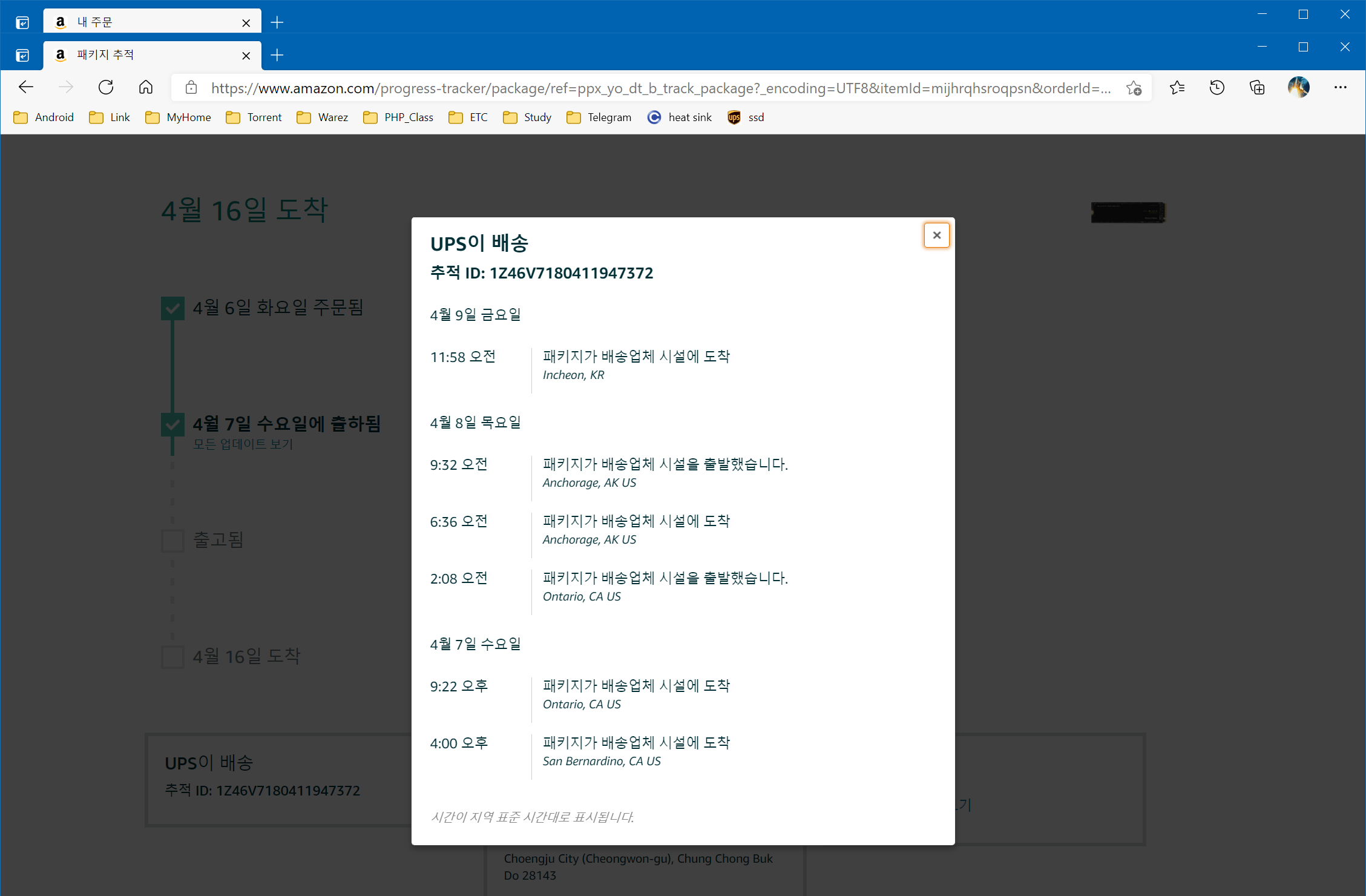 4/7 09:22 ontario에 도착 한것으로 파악 됩니다. (여기선 추적하기 힘듭니다.)