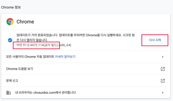 크롬에서 설정 - 도움말 - 크롬 정보에서 업데이트를 실행하여 크롬을 최신버전으로 업데이트 하세요...