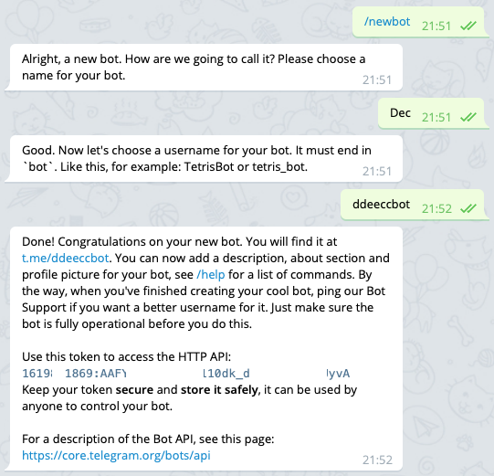 여기까지 정상적으로 진행하셨으면 Done! Congratulations on your new bot. 메시지를 시작으로 간단한 설명과 함께 봇 고유 token 이