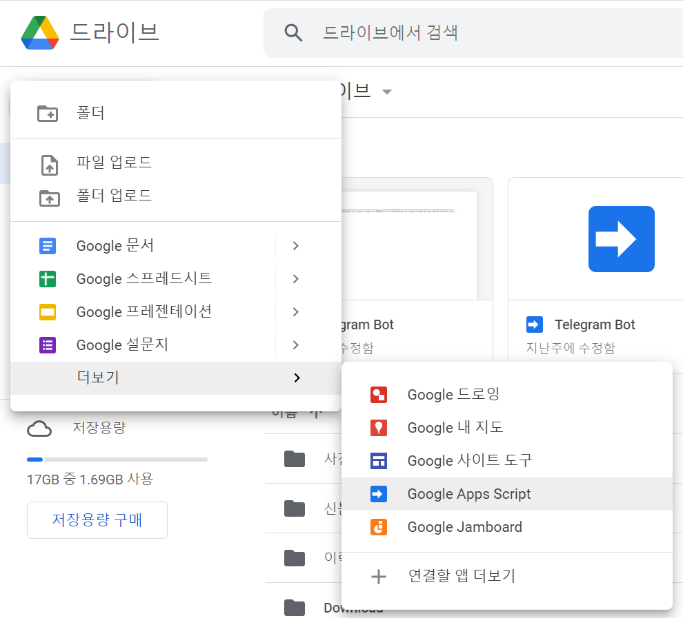 https://drive.google.com/ 에서 좌측 메뉴 상단에 새로만들기 버튼을 눌러 이번엔 Google Apps Script 를 생성합니다.