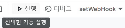 저장 해주시고 상단 메뉴에서 setWebHook 을 선택후 실행을 눌러 해당 함수를 수동으로 실행해주시면 실행 로그가 뜨면서 실행이 완료 됩니다.