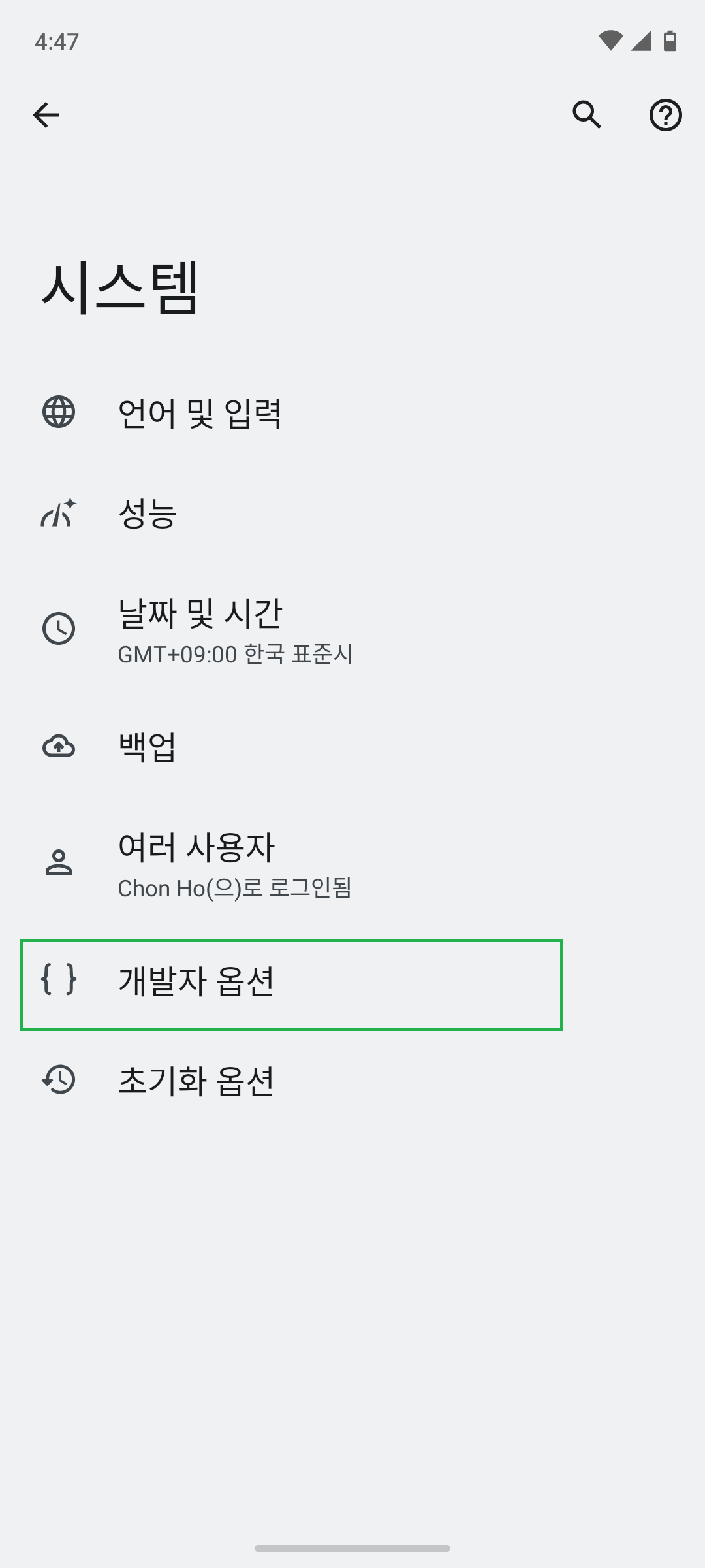설정 - 시스템 - 개발자 메뉴가 나옵니다.