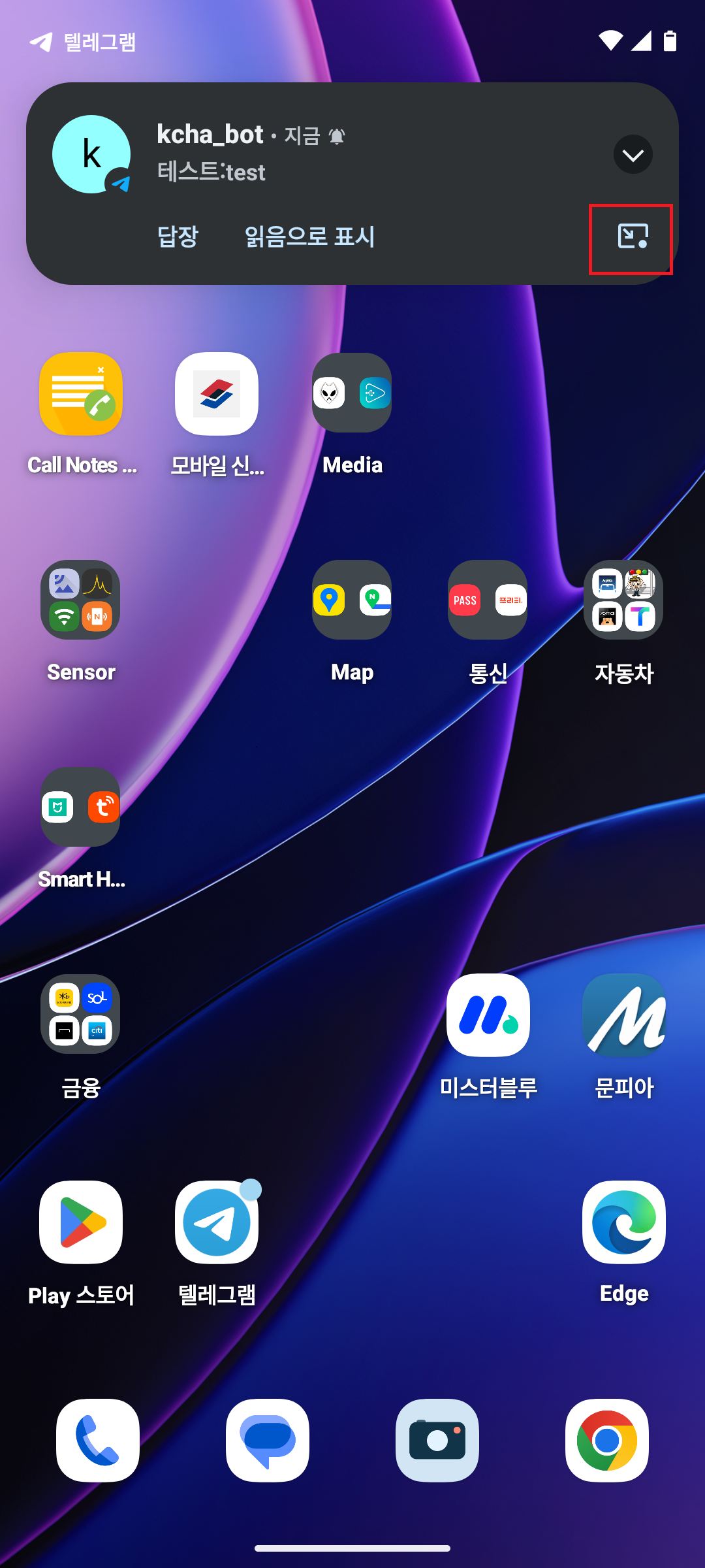 팝업창으로 띄우기 - 문자나 텔레그램등의 알림이 뜨는경우 지금 폰으로 작업하던게 있어서 화면을 넘겨서 확인하기는 그럴때 임시 팝업을 띄워 확인후 간단한 조치후 팝업창을 닫으면 하던 작업에 영향이 덜하도록 하는 방법이 있습니다.