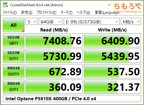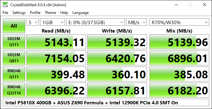 플랫폼에 따라 약간의 성능차이가 발생하지만 실사용 성능에 가까운 수치인 4K가 읽기/쓰기 모두 300MB/s 이상을 보여주는 모습에서 PCIe 5.0 SSD 모델들이 보통 읽기/쓰기 가 둘중 하나만 300MB/s 가까운 성능에 다른쪽은 100~200MB/s 수준에서 머무르고 있는 모습에서 현존하는 SSD중 실사용에선 P5810X이 최고속이 될듯 합니다.