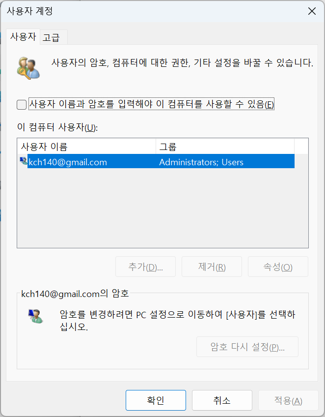 NetplWiz 를 실행 (검색등을 하시면 실행할수 있는 아이콘이 검색된 아이콘을 클릭 실행하면 위의 창이 뜹니다.)