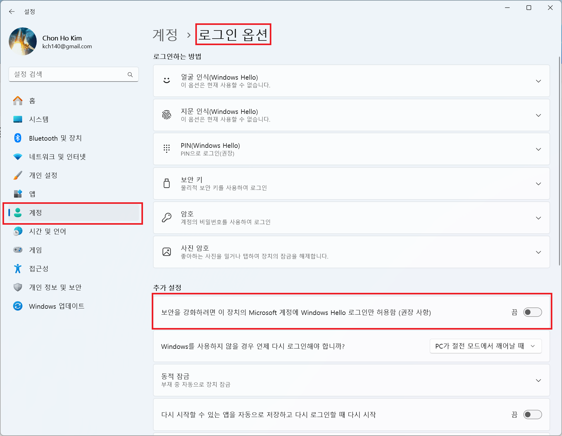 추가설정에 보안을 강화하려면 Windows Hello 로그인만 허용함 이 설정되어 있습니다.