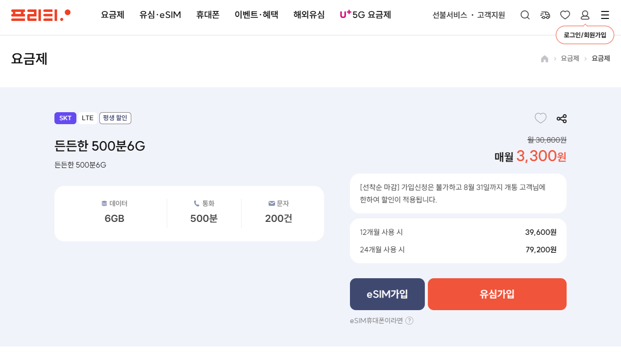 월 3300원 요금에 데이터 6기가 통화 500분까지 200문자