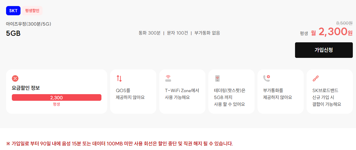 데이터 5GB / 통화 300분 / 문자 100건 / 월 2300원으로 알뜰요금제중에서도 저렴한 편으로 나온 요금제 입니다.