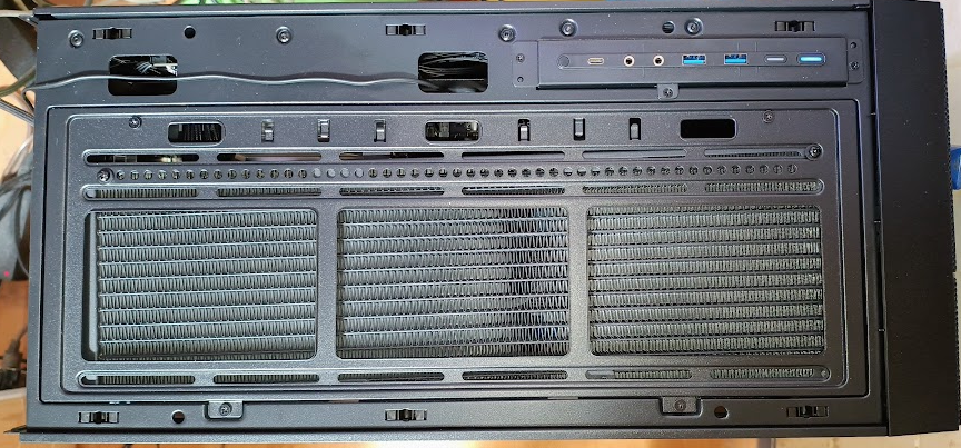 IO쉴드쪽을 케이스 바깥쪽으로 라디에이터를최대한 밀어 나사를 고정해준후 전원버튼이 있는 반대쪽을 적당히 나사구멍을 홀에 맞춰준후고정해주면 어설프지만상단에 위치시켜 임시로 사용할수 있는 상태를 유지할수 있습니다.