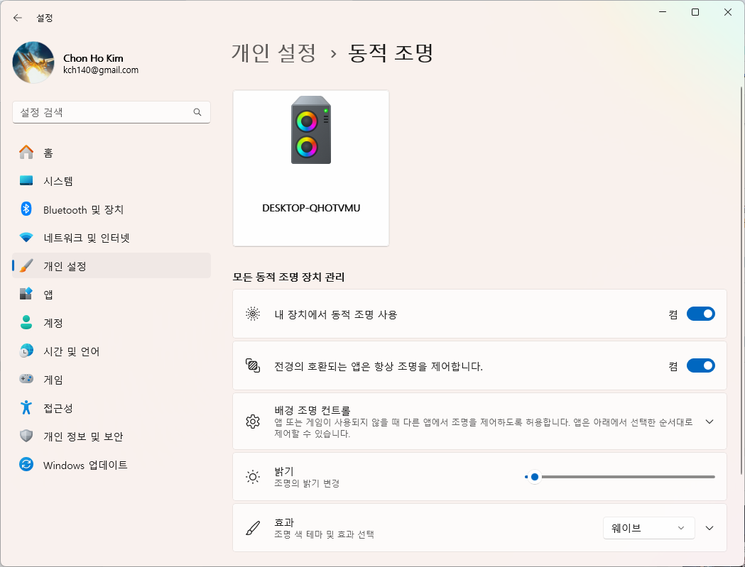 윈도우에서 설정 - 개인설정 - 동적조명 제어툴을 이용해 LED를 제어할수 있게 됩니다.