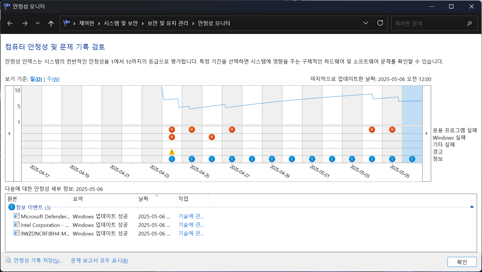 이럴때는 검색 (Win+S) 에서 '안정성 기록 보기' 를 검색