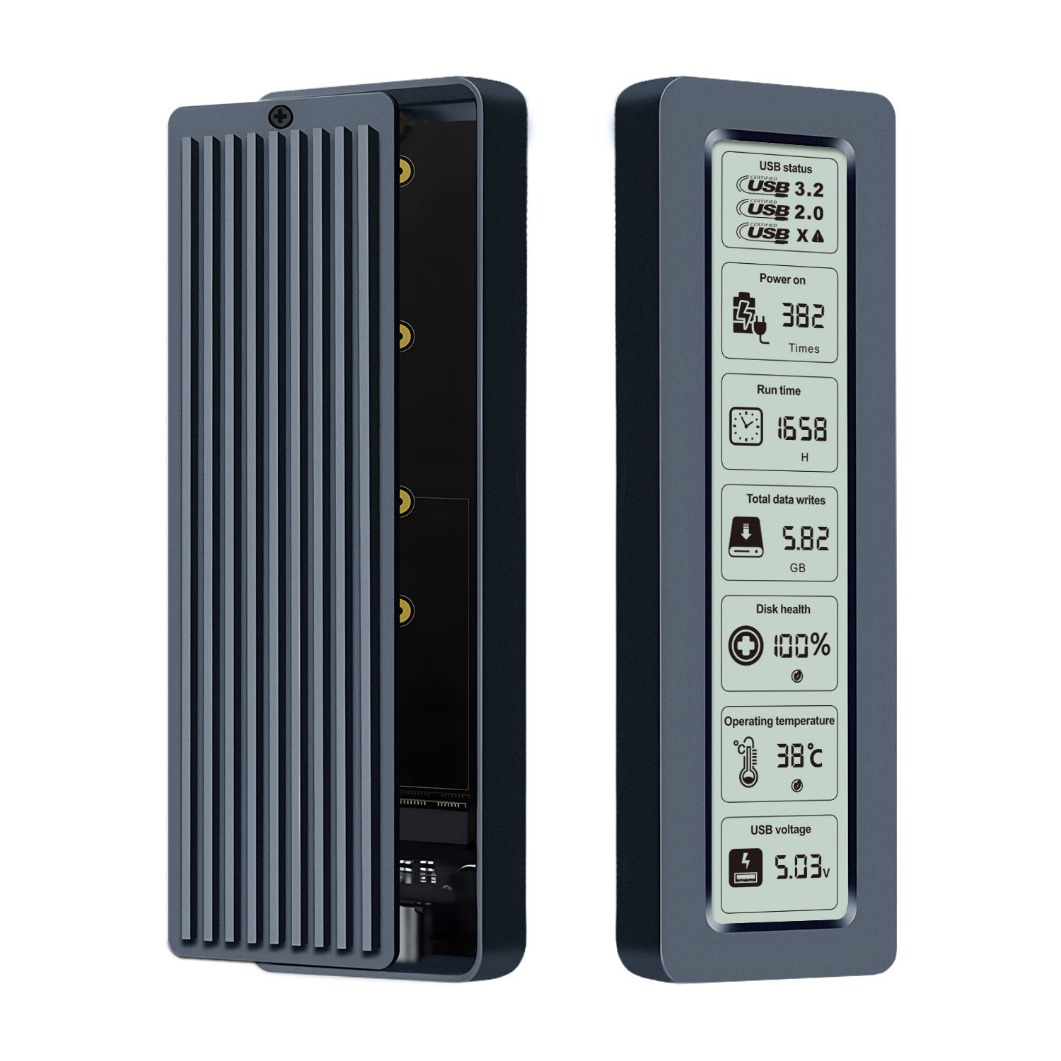 SSD 장치 관련 전원 연결 시간 , 동작 시간 , 총 쓰기량 , 드라이브 상태 , 온도, USB 전원 등을 표기하며, 이화면 또한 안에 SSD가 장착되어 인식 되지 않으면 동작하지 않습니다.